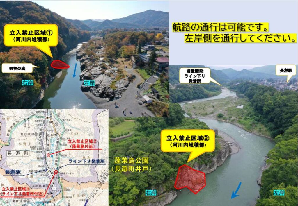 令和5年7月7日現在、航路の通行は可能ですが、できるだけ左岸側を通行してください。なお、河川内堆積物上は立入禁止となっております。